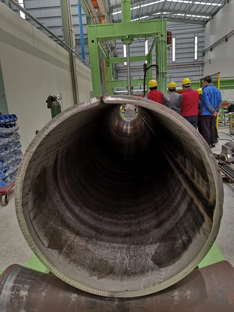 This system roll plates up to 7/8” (22 mm) thickness with a width of 20’ (6000 mm), on a pipe ID of 20” (508 mm). Material is Stainless Steel 50000 Psi.